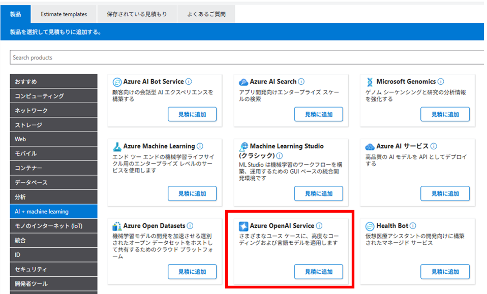 製品タブのカテゴリで「AI + machine learning」を選択するか、「Search products」で「OpenAI」と入力して検索すると表示される「Azure OpenAI Service」をクリックすると、見積もりに追加されます。