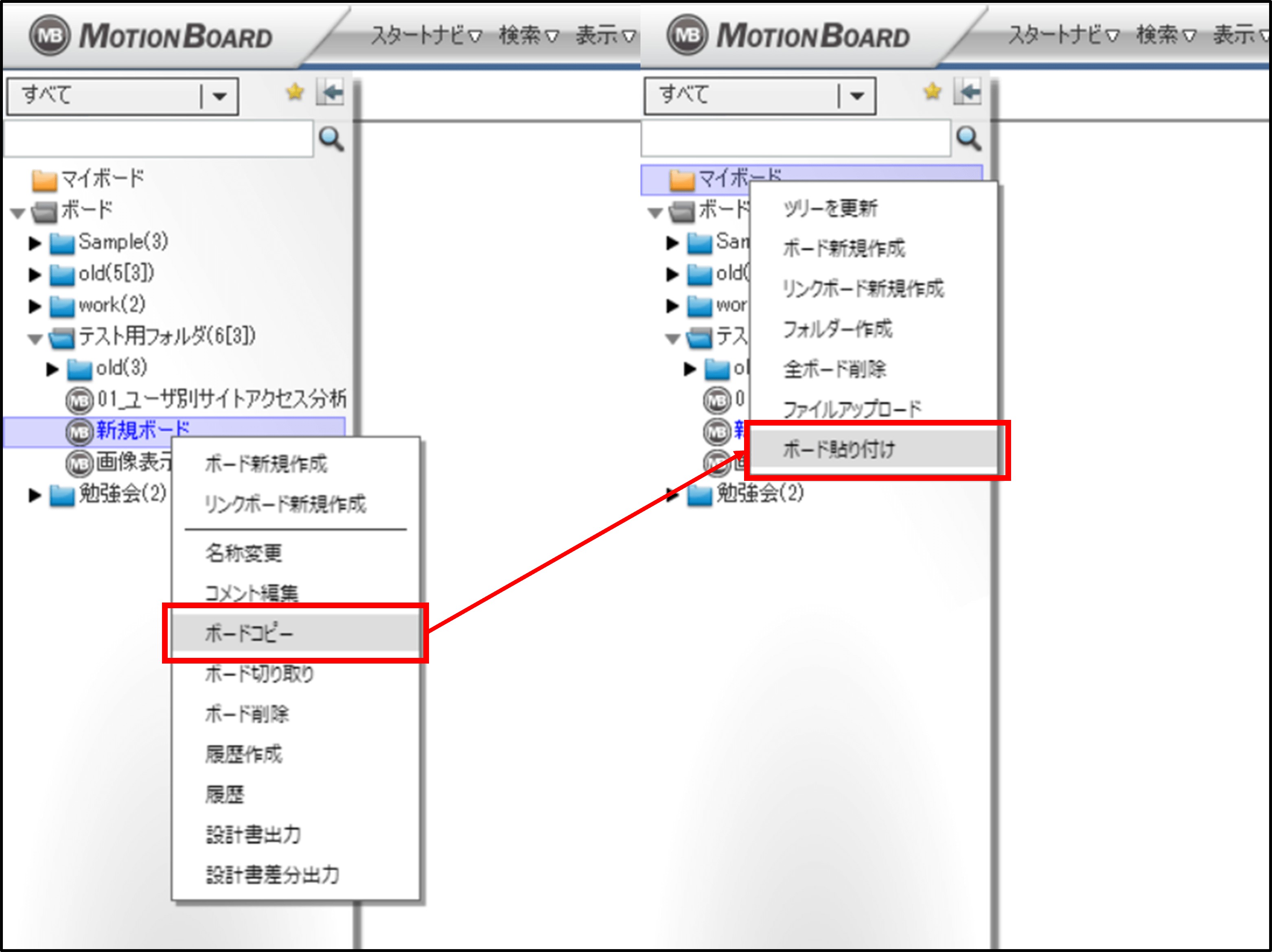 ボードツリー上で右クリックすることで、ボードのコピーや貼り付けを行うことができます。