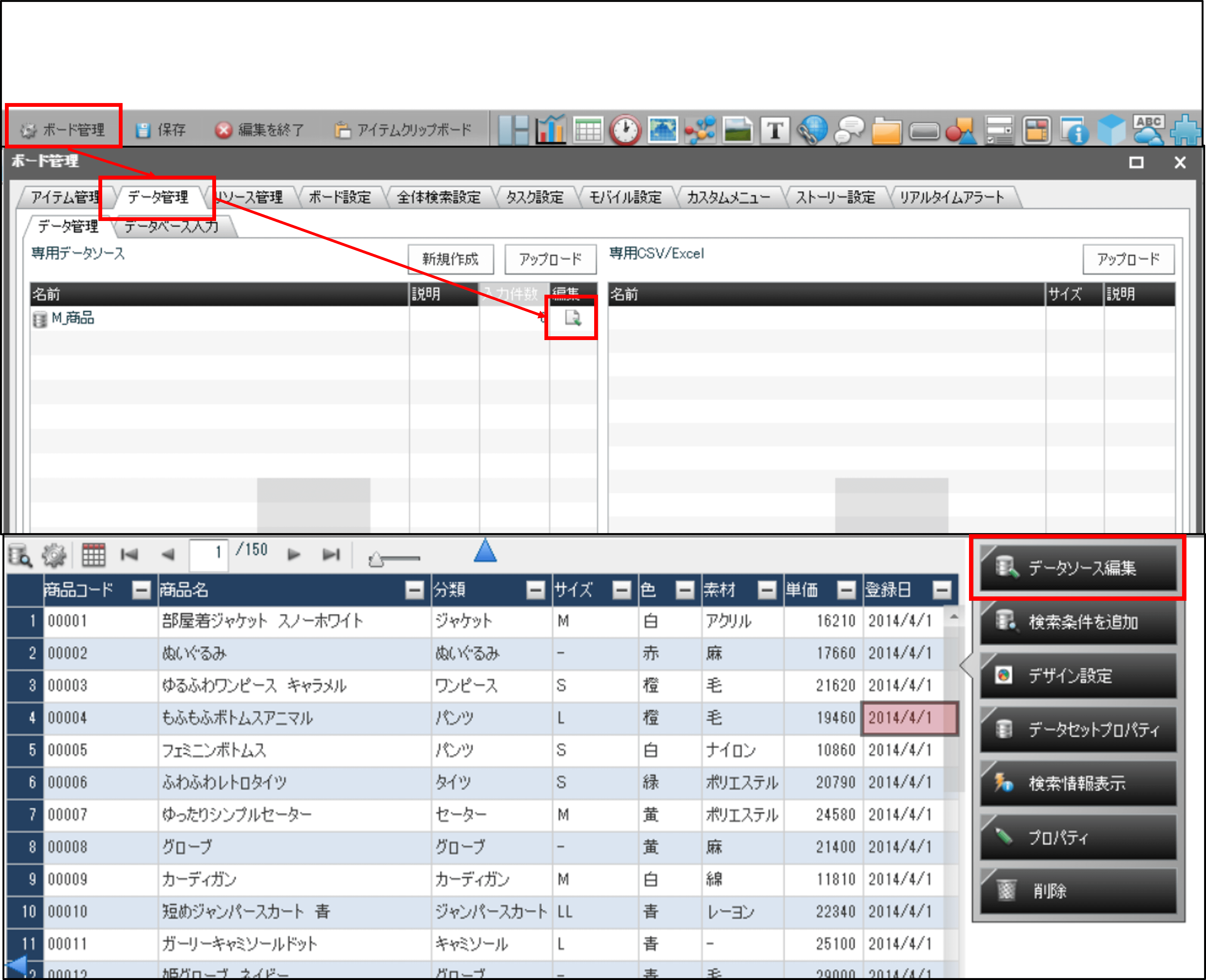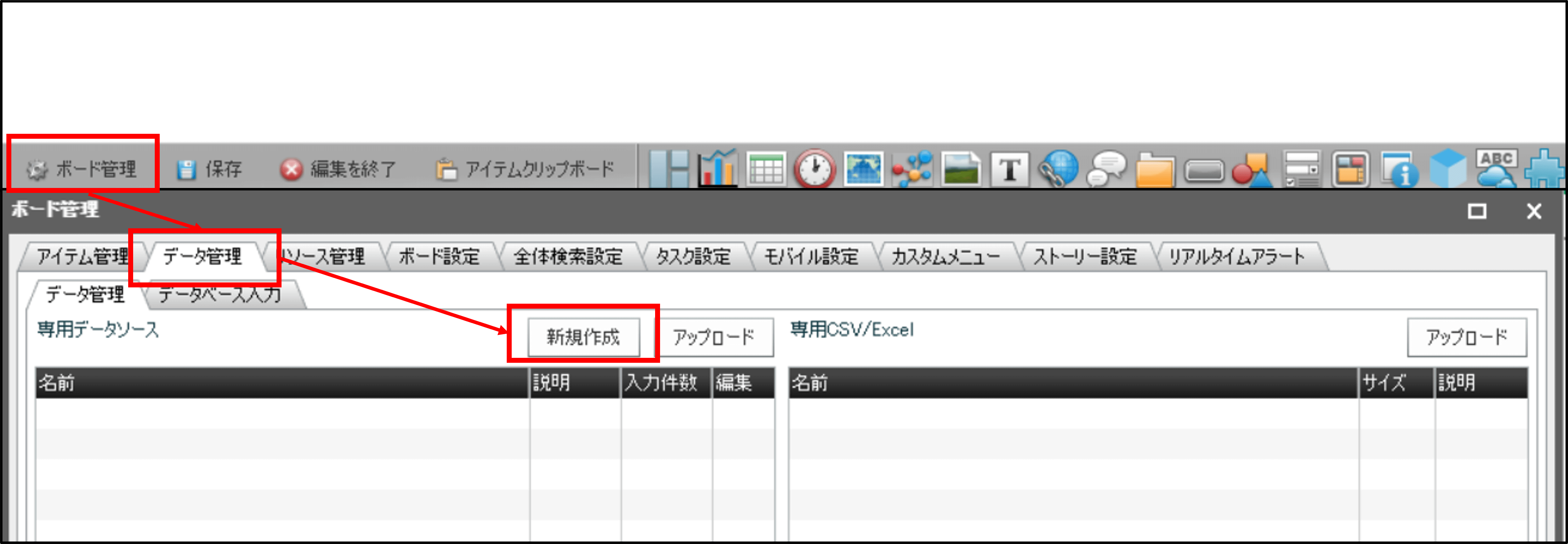 画面下部の「ボード管理」をクリックし、ボード管理画面から「データ管理」タブを選択します。