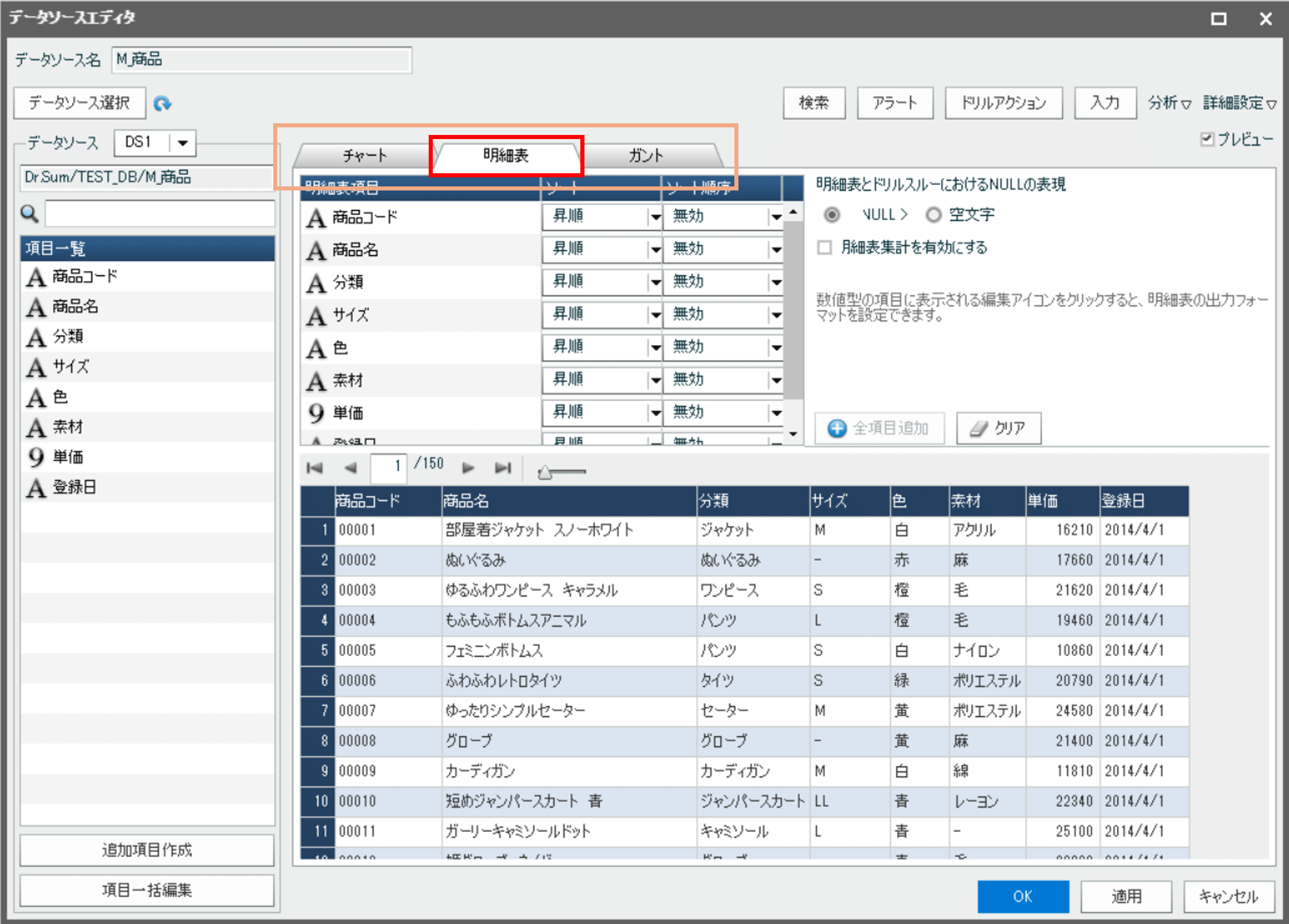 上の明細表項目に置かれた項目が明細表に表示されます。