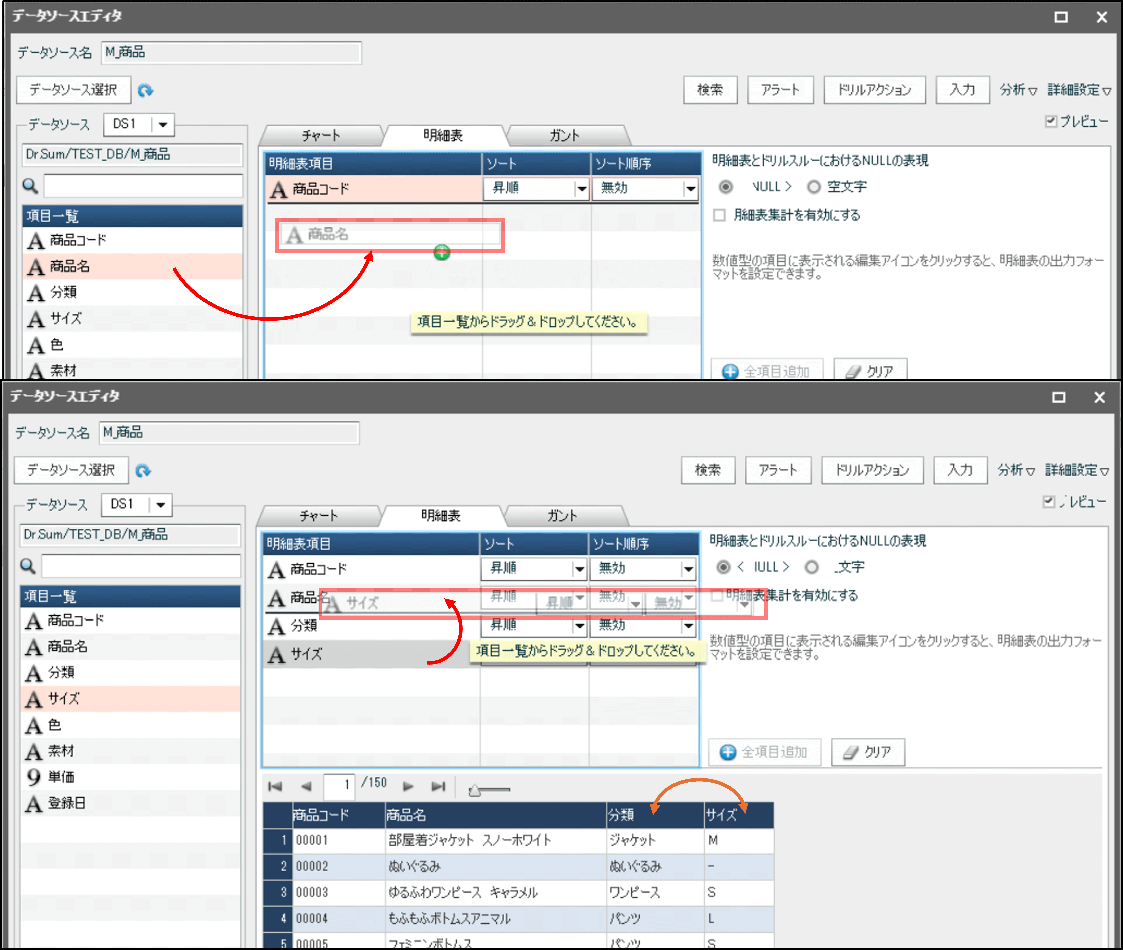 左の項目一覧にある項目を、中央の明細表項目にドラッグアンドドロップすることで追加できます。