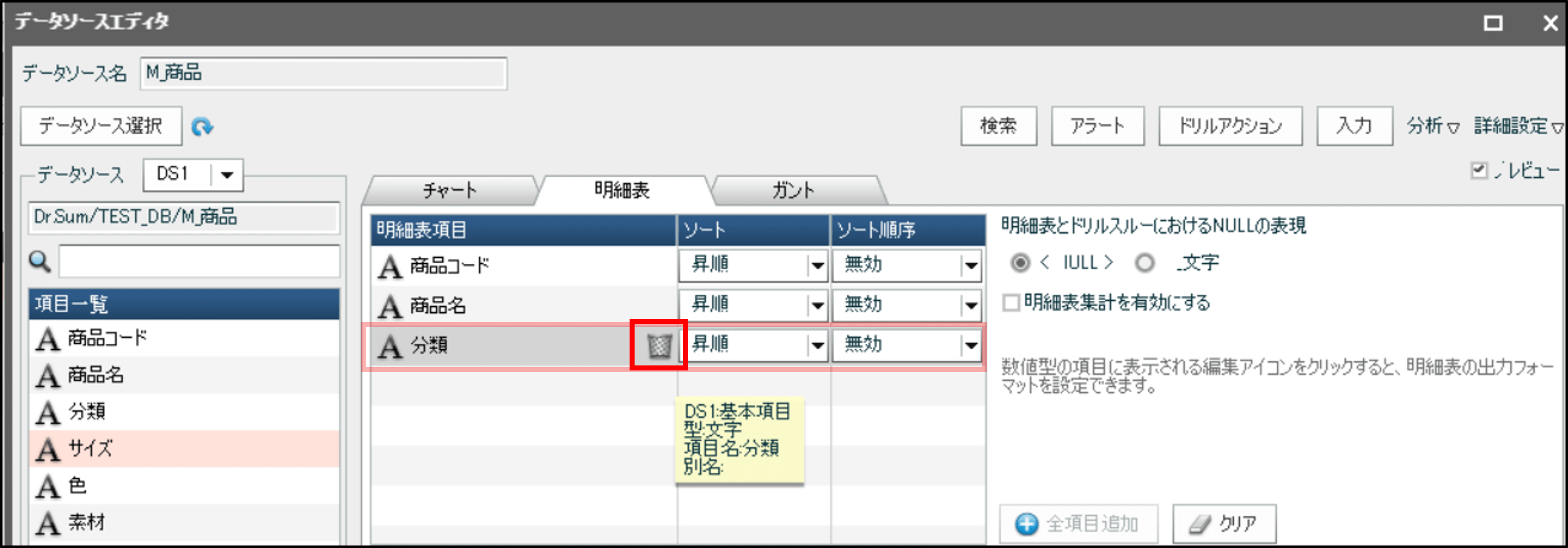 ソート順序は、明細表項目の右側にあるソート・ソート順序から変更できます。