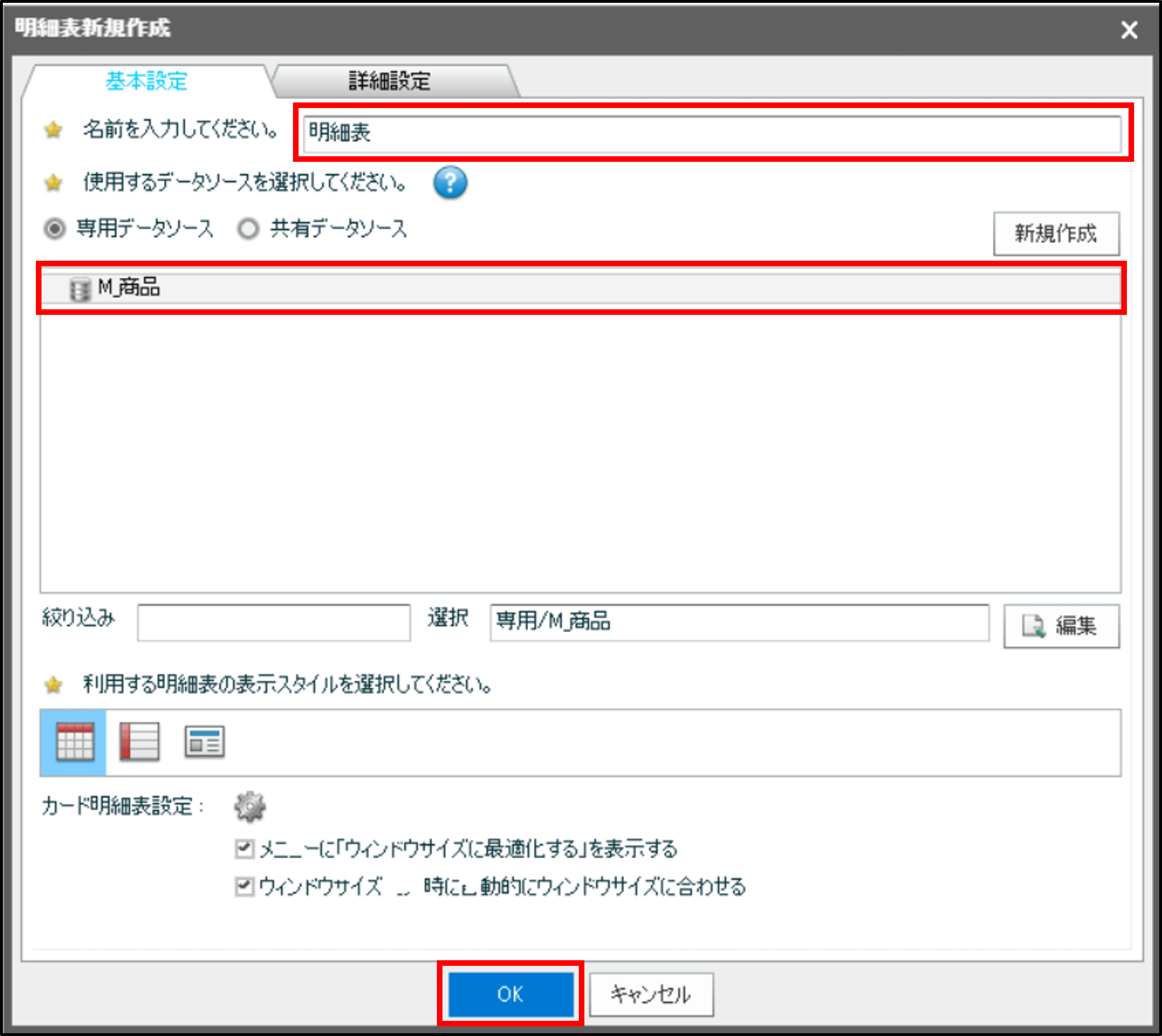 名前を入力し、先ほど作ったデータソースを選択してから「OK」をクリックします。