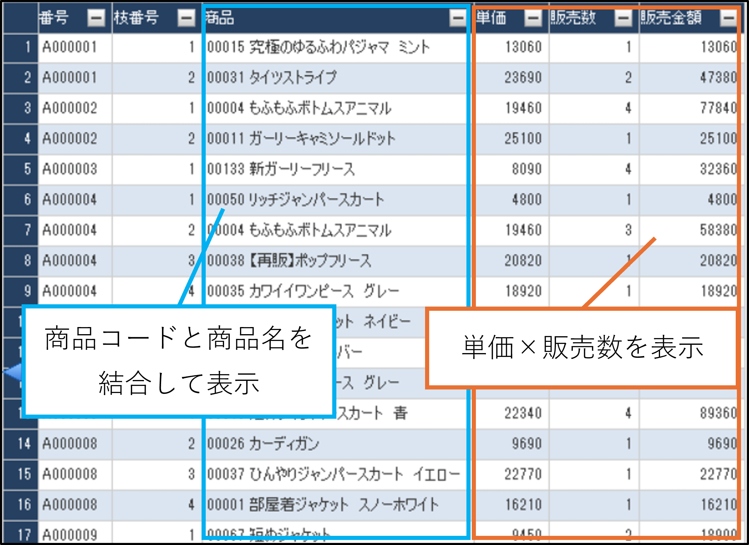 まずは、「商品コード」と「商品名」の間に半角スペースを入れて結合した「商品」という項目を作ってみます。