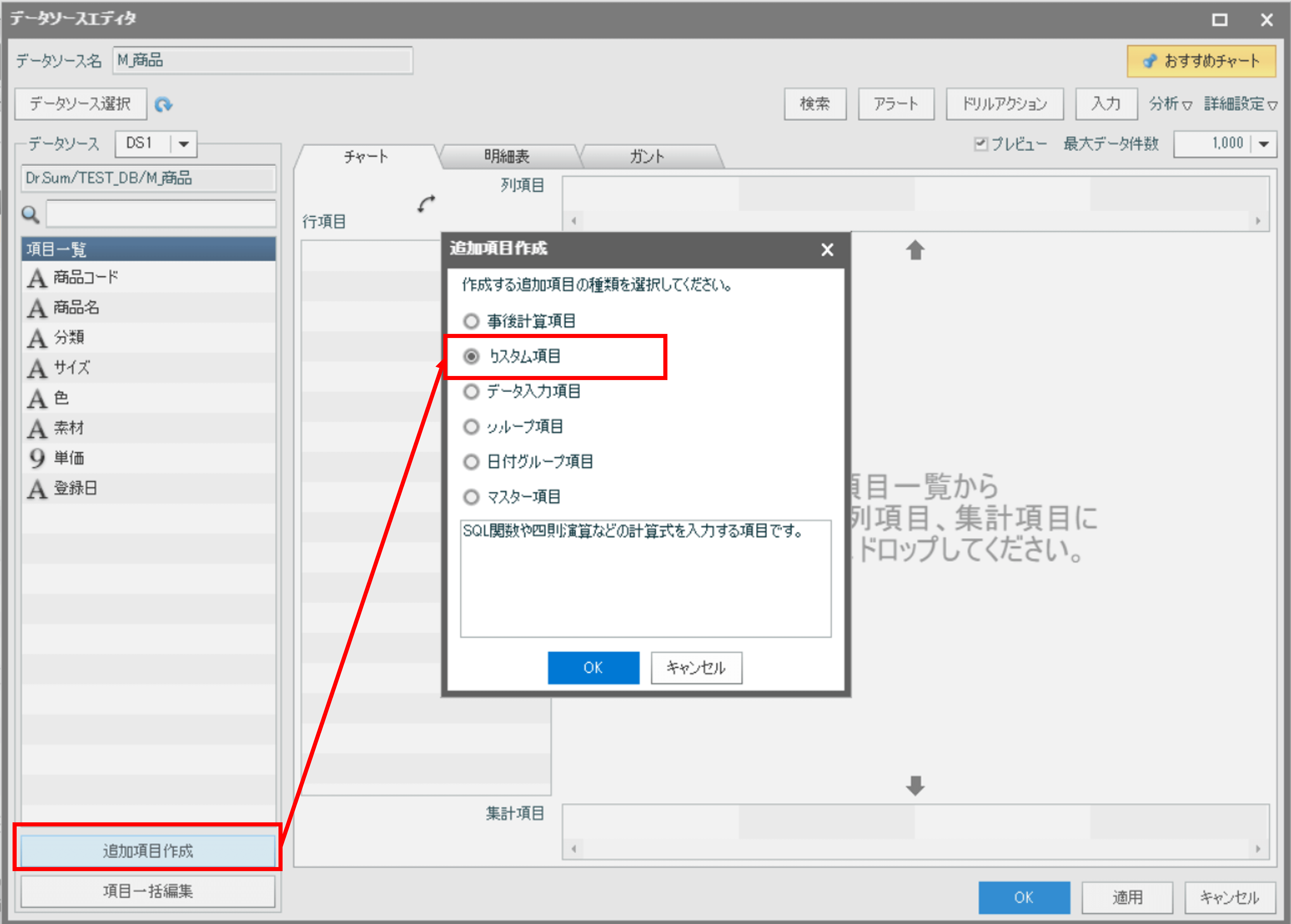 カスタム項目は、データソースエディタの左下にある「追加項目作成」から「カスタム項目」を選択して追加します。