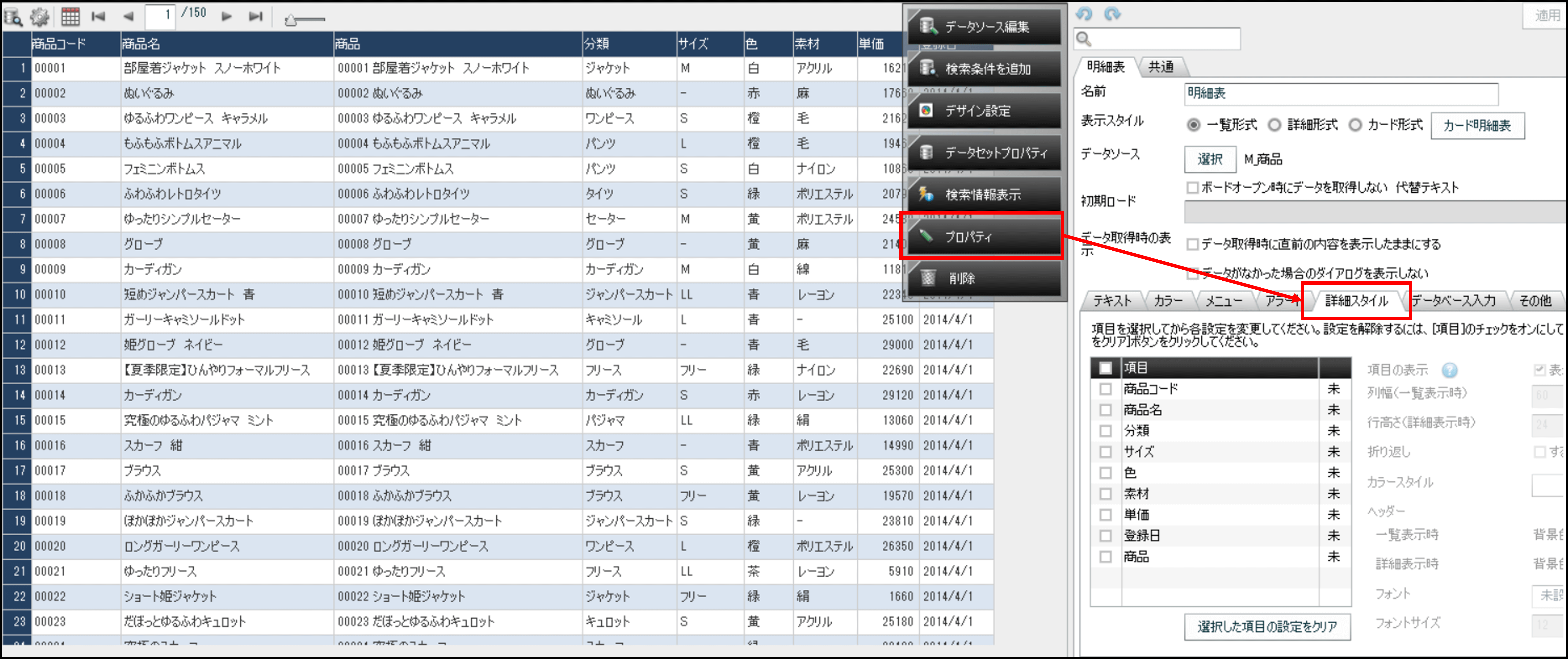 アイテムプロパティの左側に項目名が表示されているので、デザインを変えたい項目を選択します。