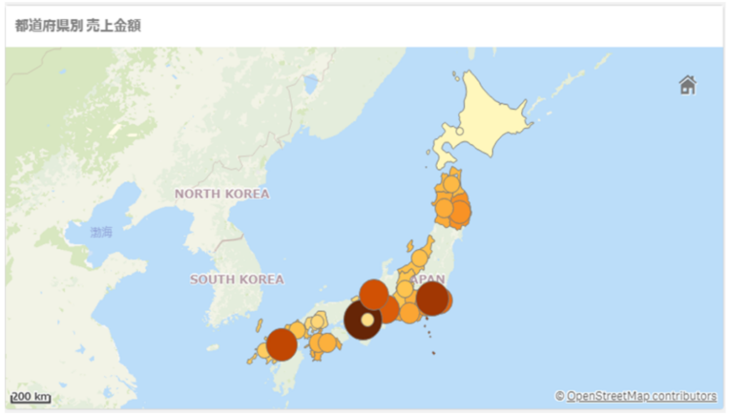 上に示す日本地図は「マップチャート」と呼ばれ、円の大きさや色の濃さで都道府県毎の売上額を示しています。