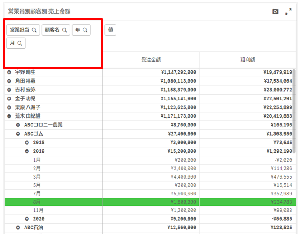下に示すピボットチャートでは、営業担当・顧客・年・月毎の金額を表示しています。