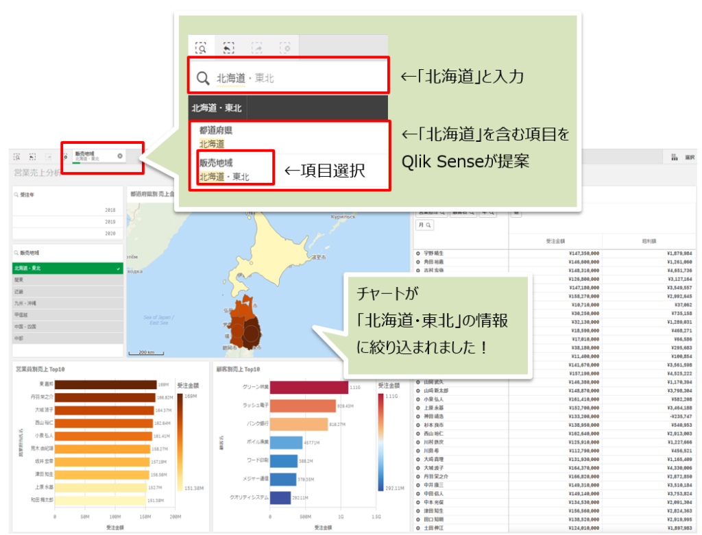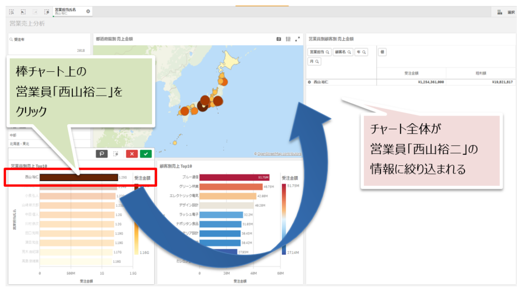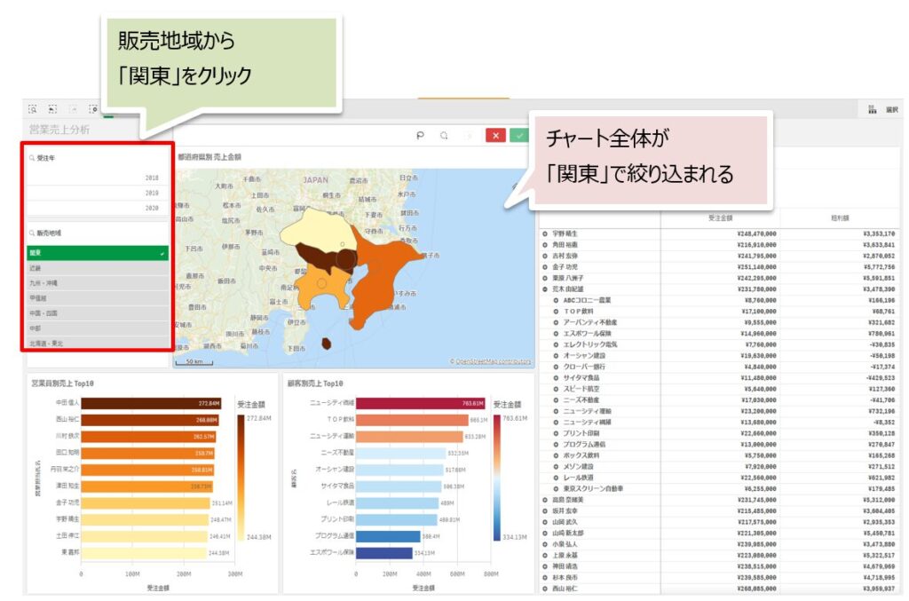 また、「Qlik Sense」で面白い機能の一つが画面のどこからでもデータの絞り込みができるところです。