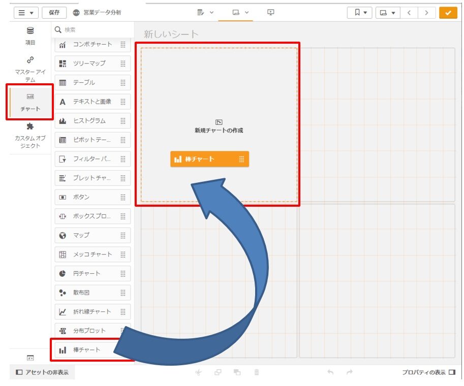 画面左側の「チャート」から「棒チャート」を選択し、ドラッグ&ドロップします。