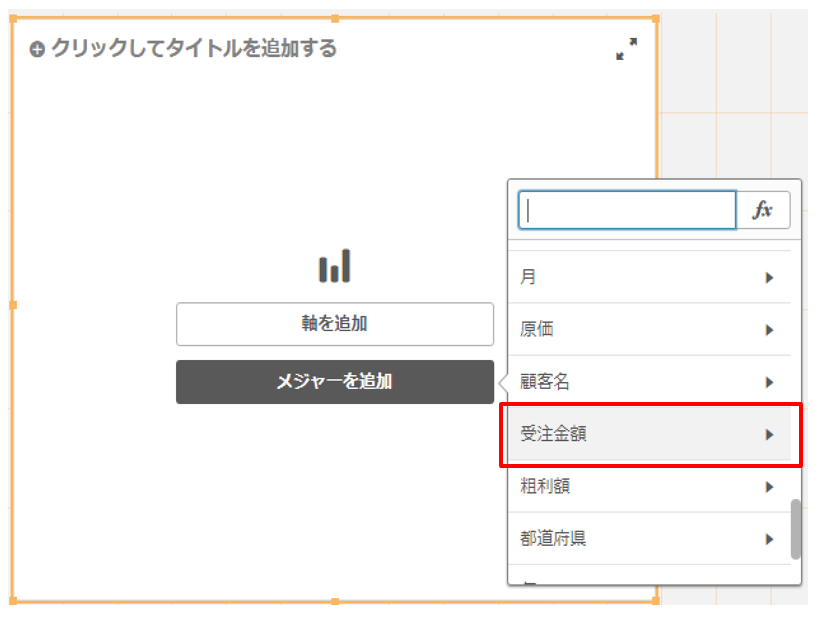 ・「メジャーを追加」で「受注金額」を選択し、集計で「Sum(受注金額)」(合計)を選択します。