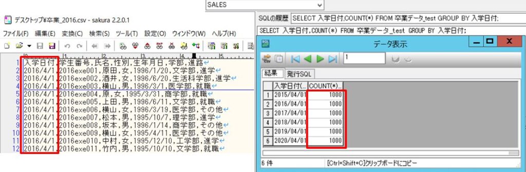 ローテーションの動作を確認するために、入学日付が2015/4/1~2020/4/1となる、6年分の卒業生データを6,000件用意しました。