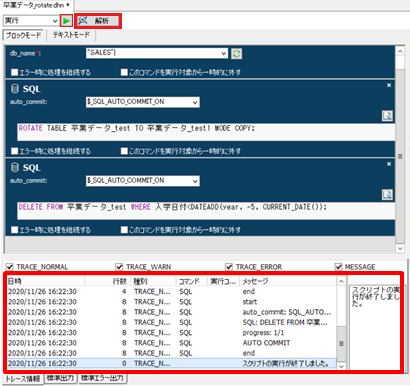 DS Scriptを利用して、テーブル「卒業データtest」がローテーションされていることを確認しましょう。