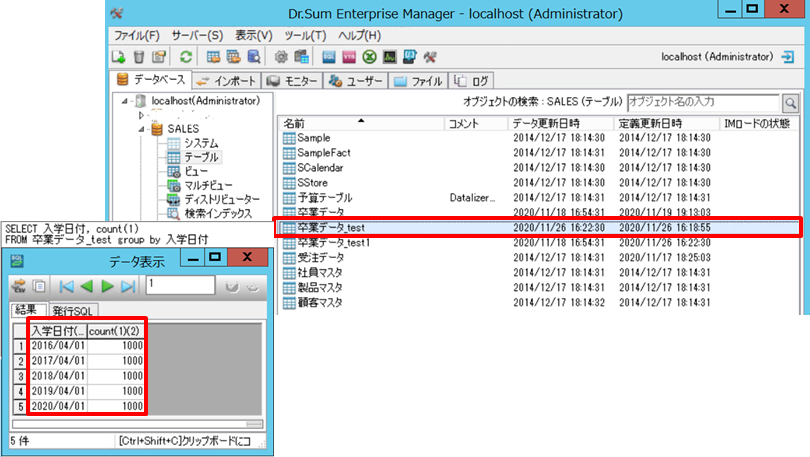 ・ローテーション後のテーブル「卒業データtest_1」は、元テーブル「卒業データtest」をコピーしたため、データ件数が元テーブルと同じです。