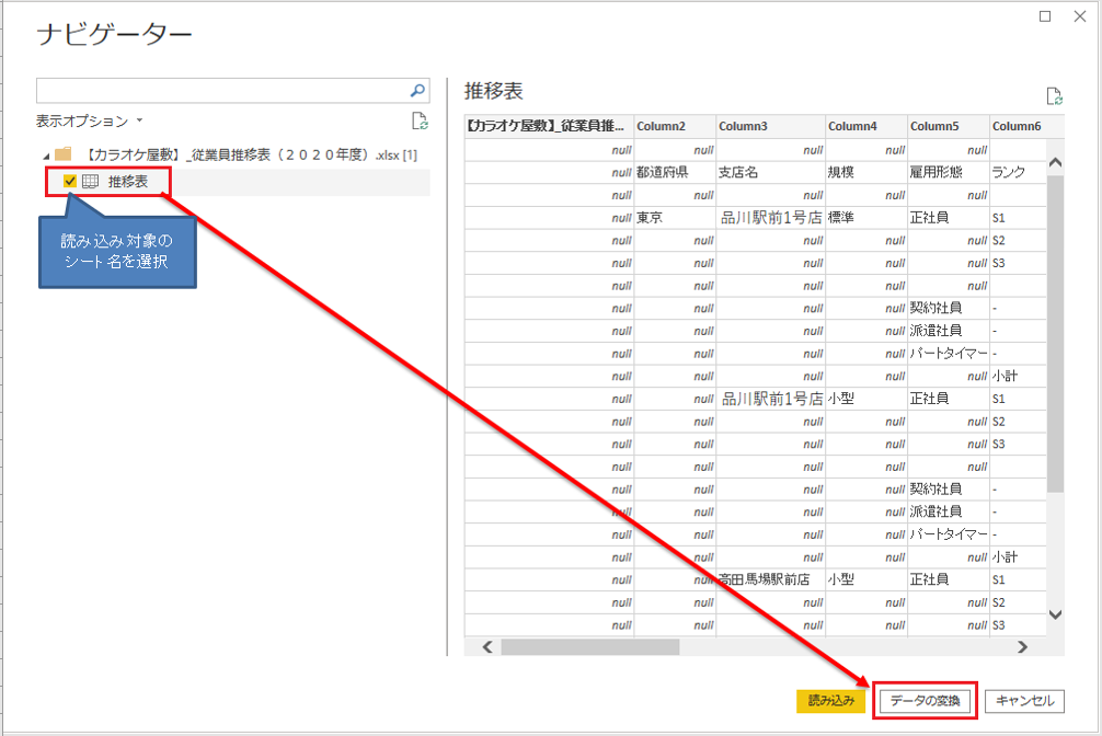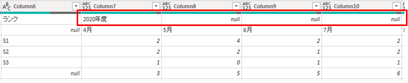 再度「入れ替え」を行い、行・列を元に戻せば、Column8以降の右の列の1行目に存在していたnullは、全て「2020年度」に置き換わっているはずです。