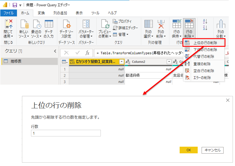 「上位の行の削除」というポップアップが表示されるので、ここでは「1」と指定します。