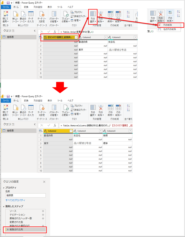 実はこれ、Power Queryエディターがこれまで行った、行を削除したりヘッダーを変更したりといった操作を記録しているのです。