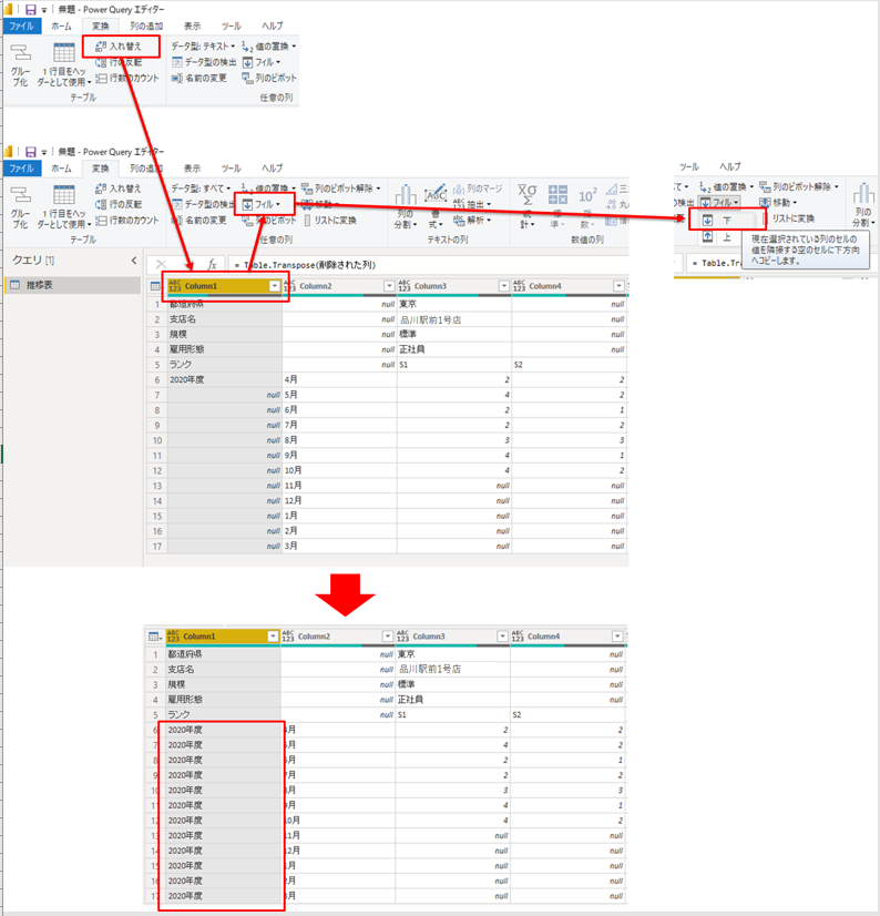 そうすると行・列が入れ替わるので、対象の列を選択してから[ホーム]タブの「フィル」を選択し、「下」方向に適用します。