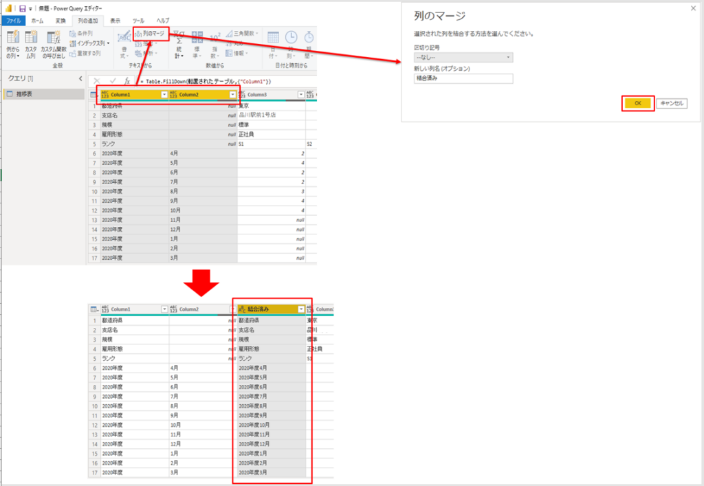 Column1とColumn2を選択し、[列の追加]タブから「列のマージ」を実行します。