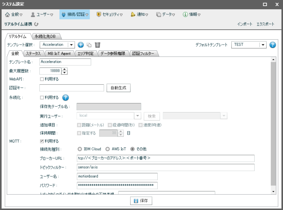 「システム管理」→「接続/認証」→「リアルタイム連携」 - 「MQTT:利用する」チェックボックスを有効にします。