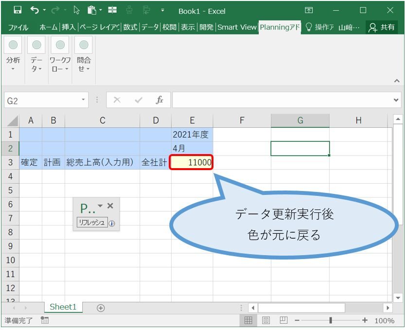 データを10000 ⇒ 11000に変更すると、セルの色が変わります(この状態ではまだデータの更新は未完了)。