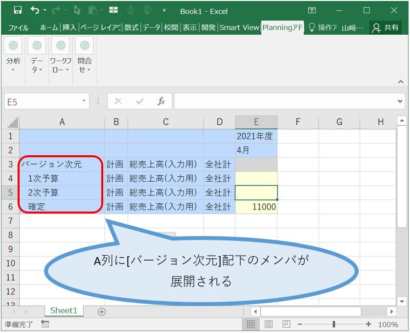 ※1:Excelシート上に何も定義されてない場合は、Planningで定義されているすべての次元のメンバがシート上にマトリックス形式で展開され、データが表示されます。