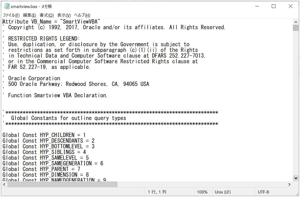 SmartViewをインストールしたフォルダ(デフォルトは「C:¥Oracle¥SmartView」)の「bin」フォルダ内に「smartview.bas」というファイルがあるので、エディタで開きます。