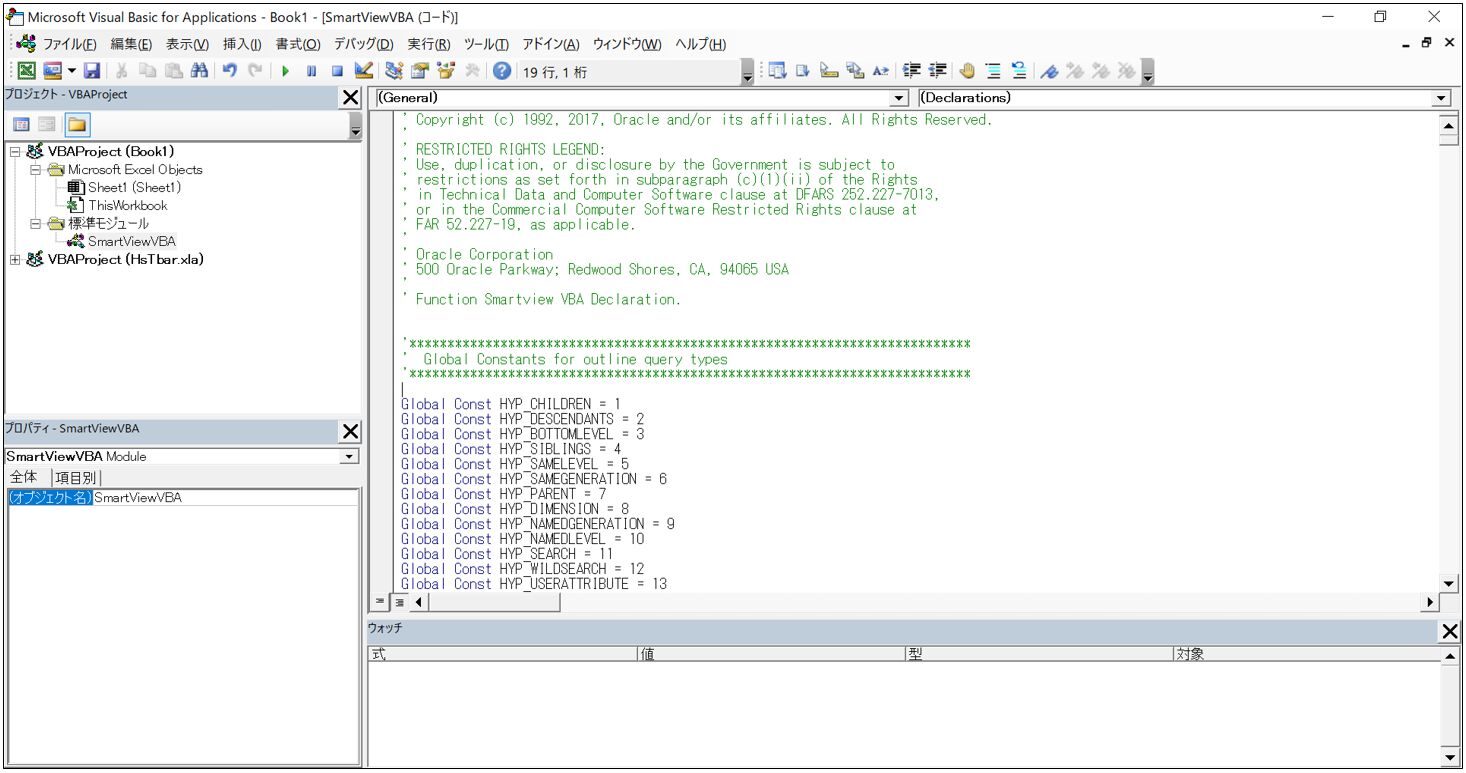 SmartViewをインストールしたフォルダ(デフォルトは「C:¥Oracle¥SmartView」)の「bin」フォルダ内に「smartview.bas」というファイルがあるので、エディタで開きます。