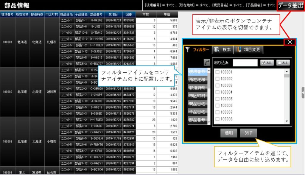 • フィルターアイテムをコンテナの上に配置し、フィルターを使いたい時に表示ボタン(データ抽出)でコンテナを表示させる
