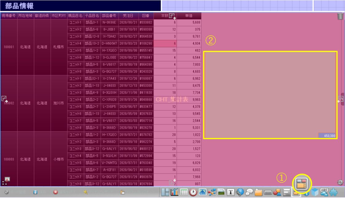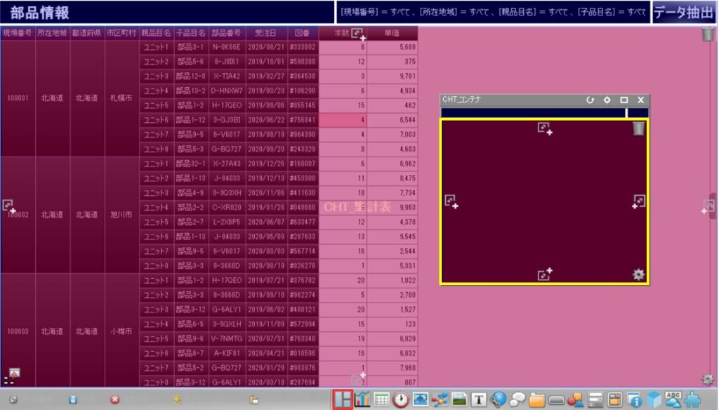 また、同じデータソースを基に作られた複数のチャートアイテムに対して、同時にデータを絞り込んだり、検索したりすることができます。