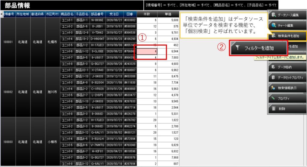 ※「検索条件を追加」で「個別検索」を作成でき、個別のデータソース定義を持つアイテム(チャート、明細表など)に表示されるデータを絞り込めます。