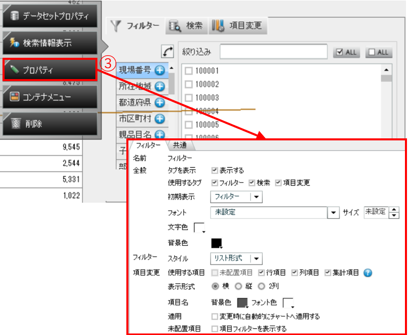 ③フィルターのプロパティより、各表示項目を設定できます。