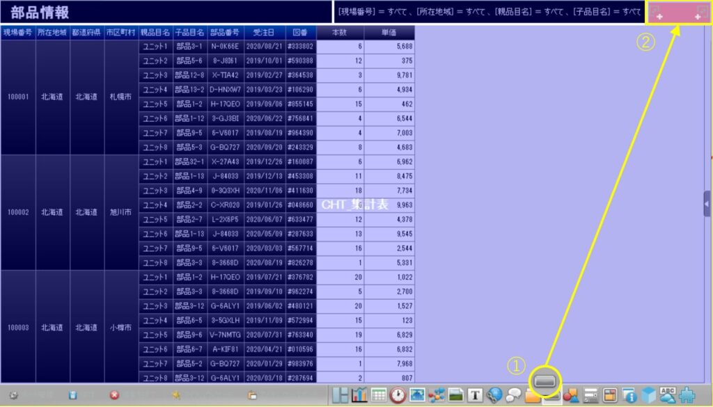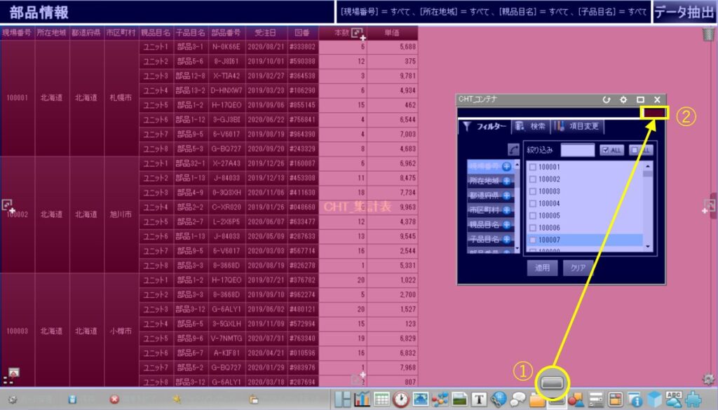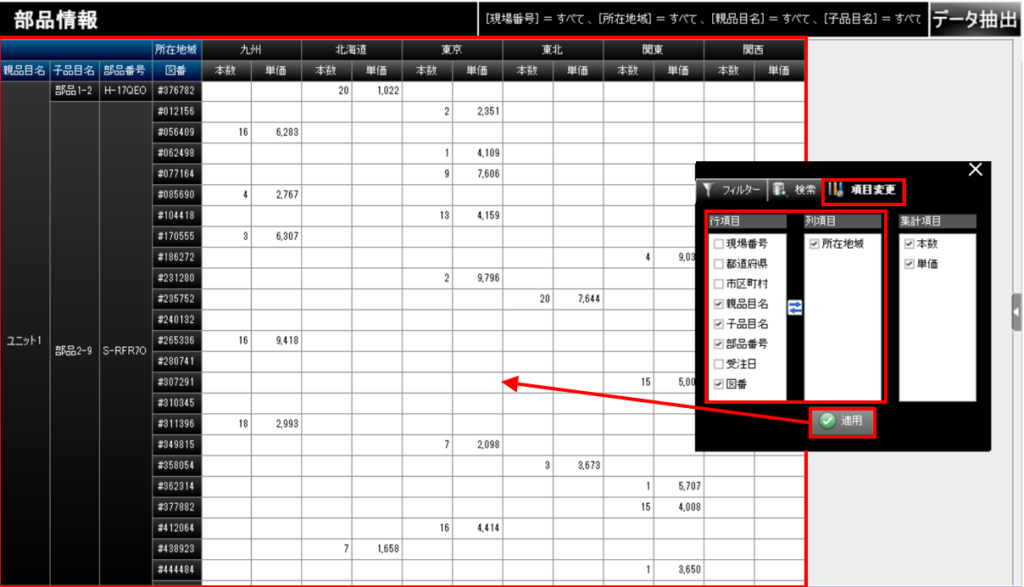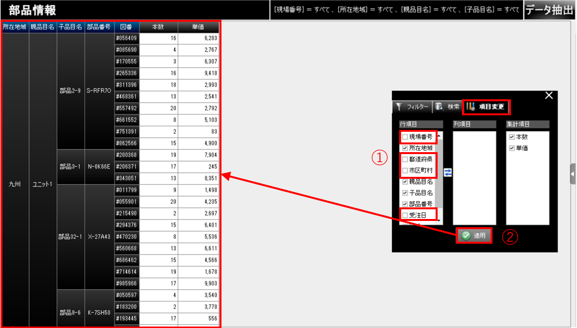 「所在地域」ごとに部品の情報を絞り込みたい場合には、例えば、以下のようにいくつかの行項目のチェックを外して(①)[適用]ボタンをクリックすると、チャートのデータの不要な項目を非表示にすることができます。
