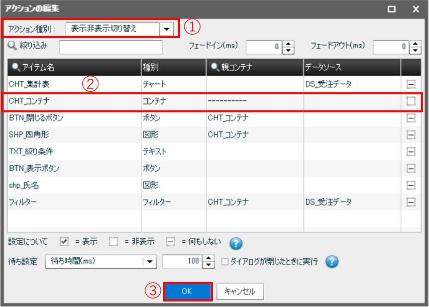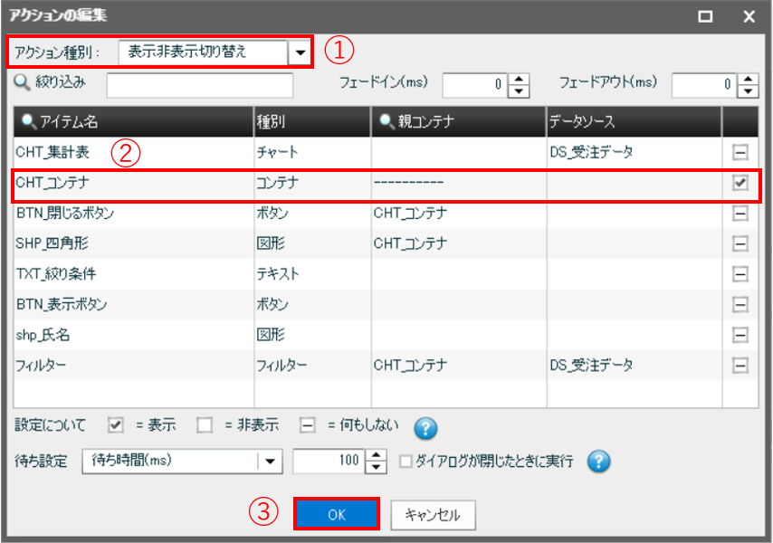 ①[アクション種別]では[表示非表示切り替え]を選択します。