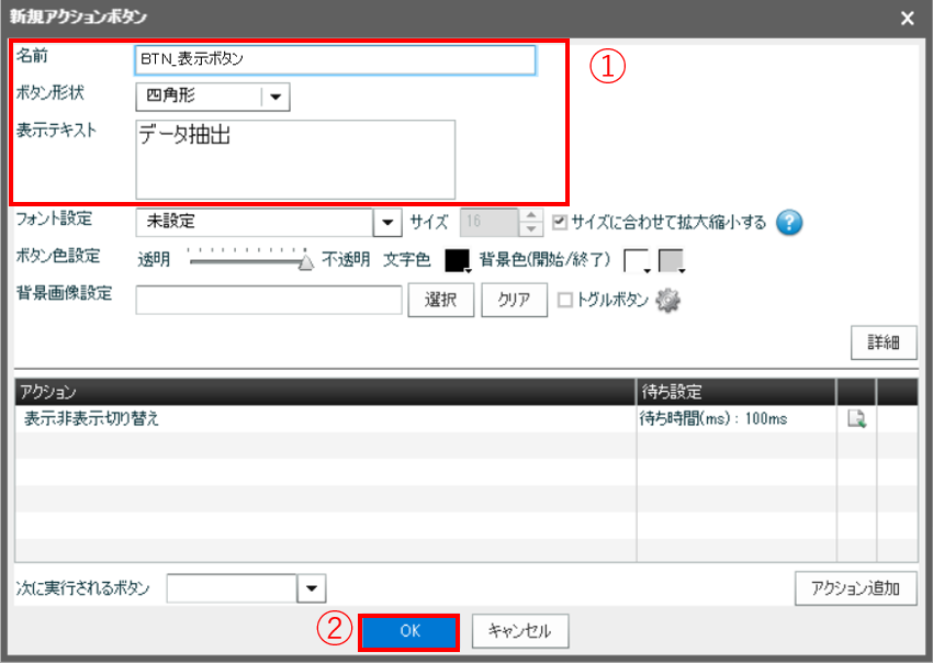 ①ボタンの名前と表示テキストを編集します。