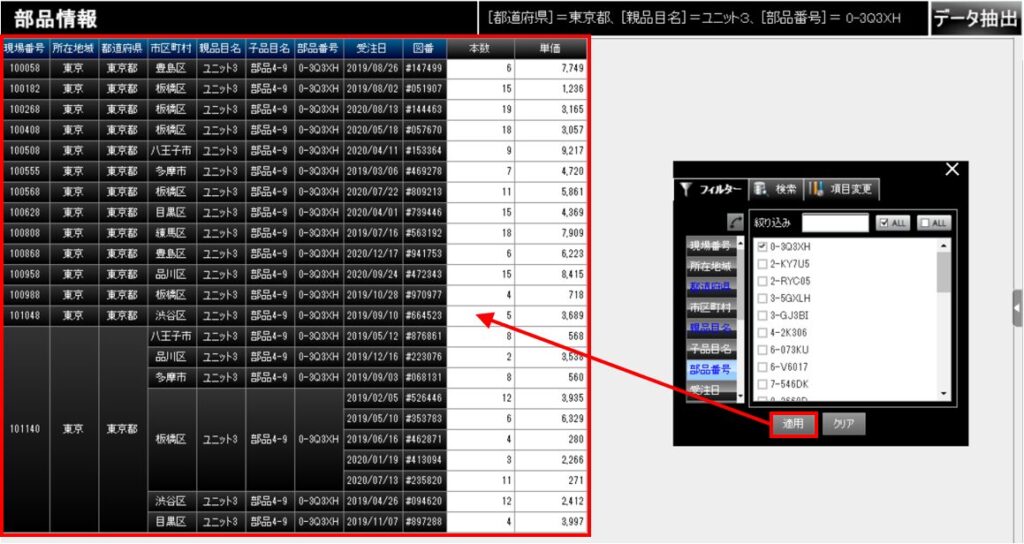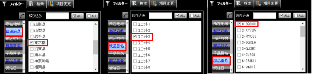 「フィルター」タブを利用して、項目ごとに部品情報を絞り込みましょう。