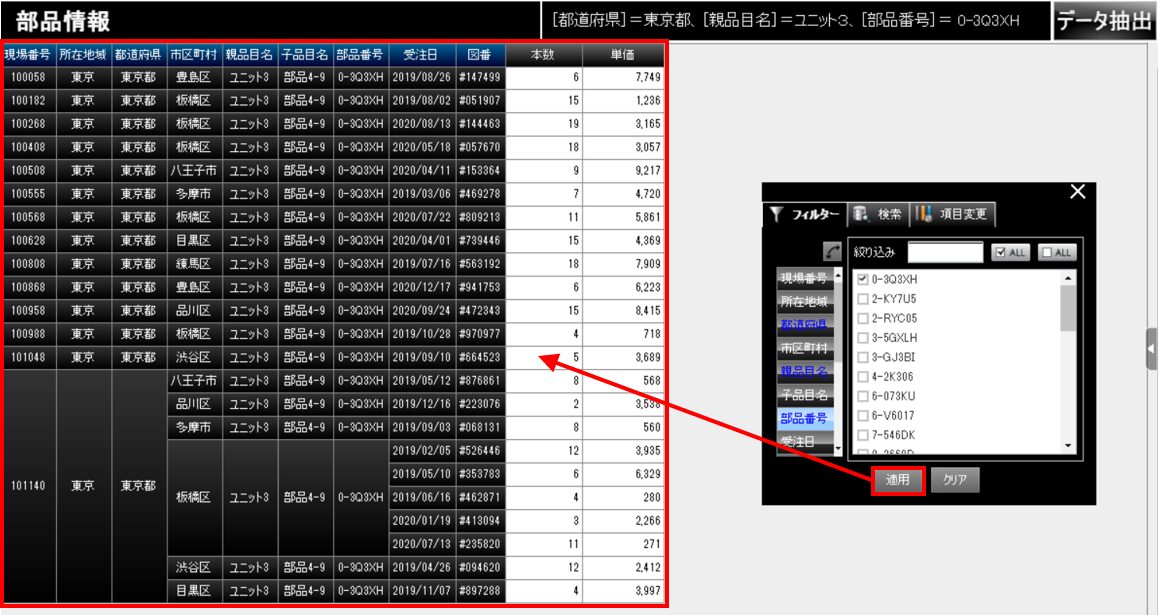 [適用]ボタンをクリックすると、チャートは「都道府県が東京都、親品目名がユニット3、部品番号が0-3Q3XH」のデータだけに変わりました。