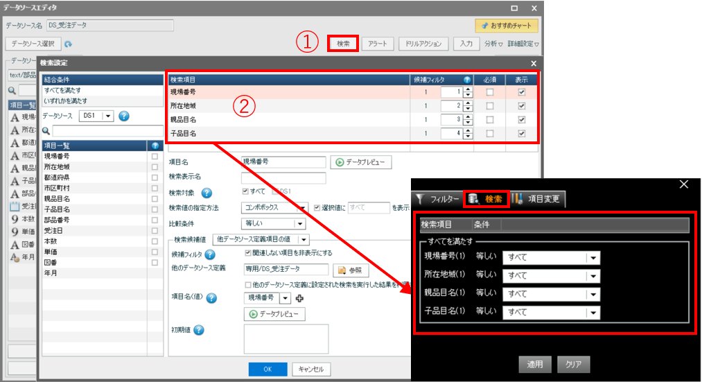 データソースエディタを開いて、「検索」ボタン(①)で検索項目の設定(②)を行います。