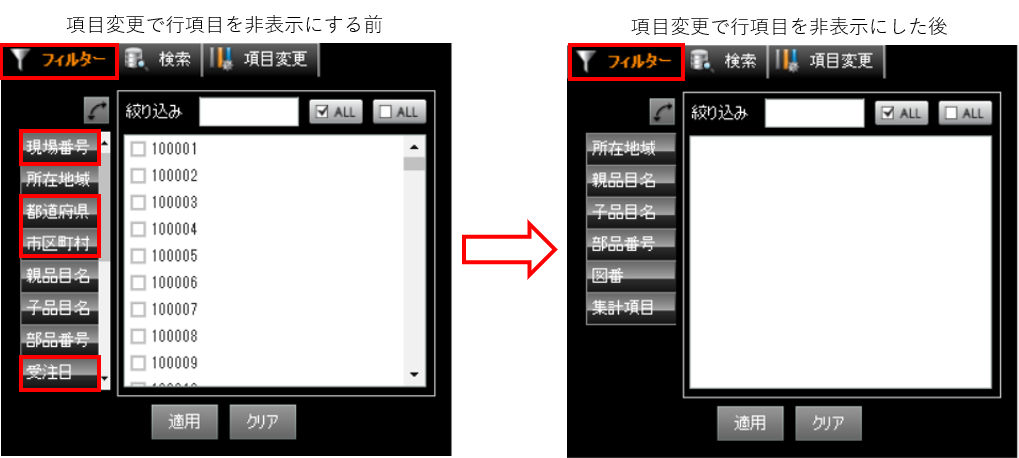 また、「項目変更」タブで非表示にした項目は、「フィルター」タブで表示されません。