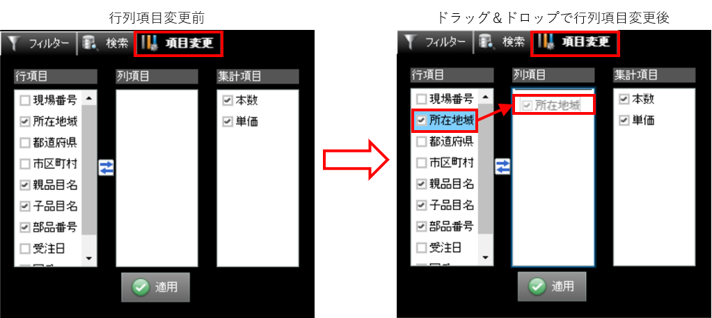 行項目の「所在地域」を、列項目にドラッグ&ドロップで入れ替えましょう。