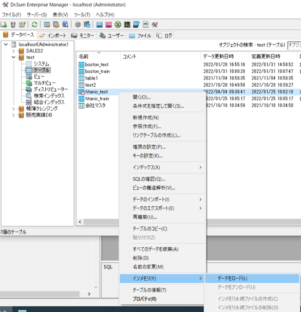 作成したテーブルの上で右クリックし、「プロパティ」→「インメモリ化する」を選択します。