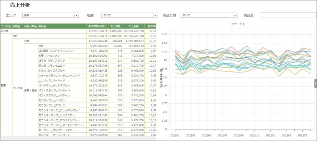 300万件ほどのデータを使用し、集計表と折れ線グラフの2つのチャートを表示します。