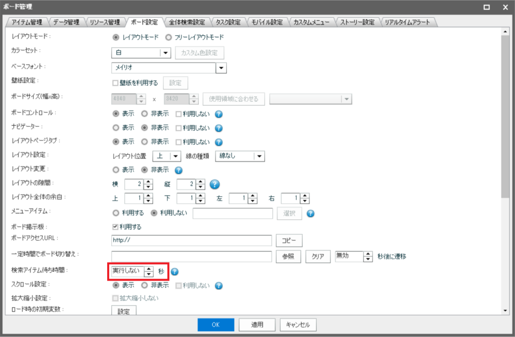 ボード管理>ボード設定から、検索アイテムの待ち時間を「実行しない」に変更します。