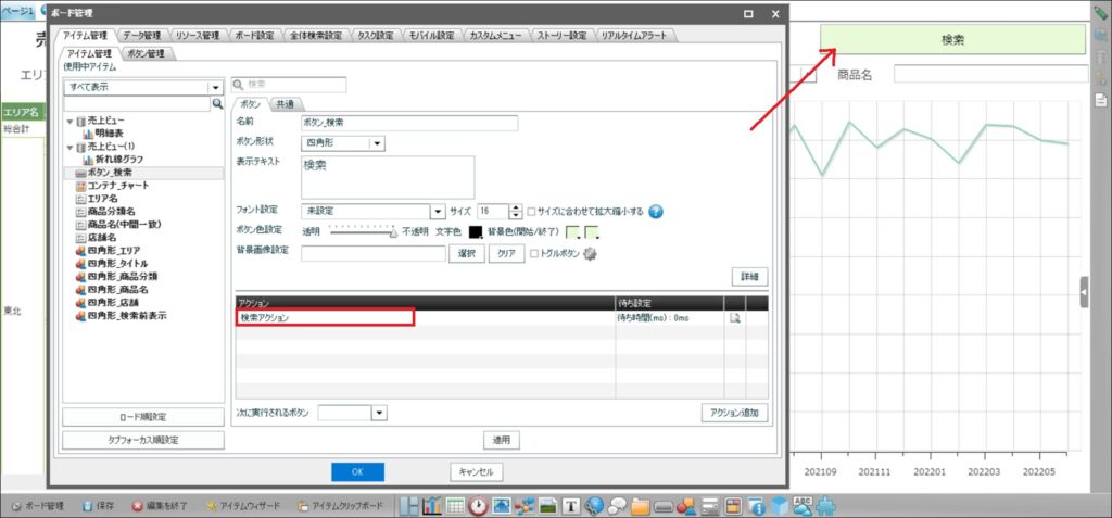 ボタンのアクションには、検索アクションを設定しボード上のチャートに対して検索が行われるようにします。