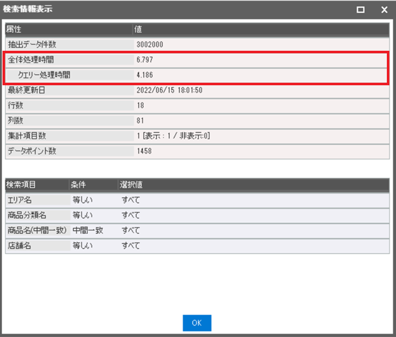 これはデータの取得からMotionBoardでの集計処理が完了するまでにかかった時間で、全体処理時間からクエリー処理時間を引いたものがMotionBoardでの集計処理自体にかかっている時間になります。