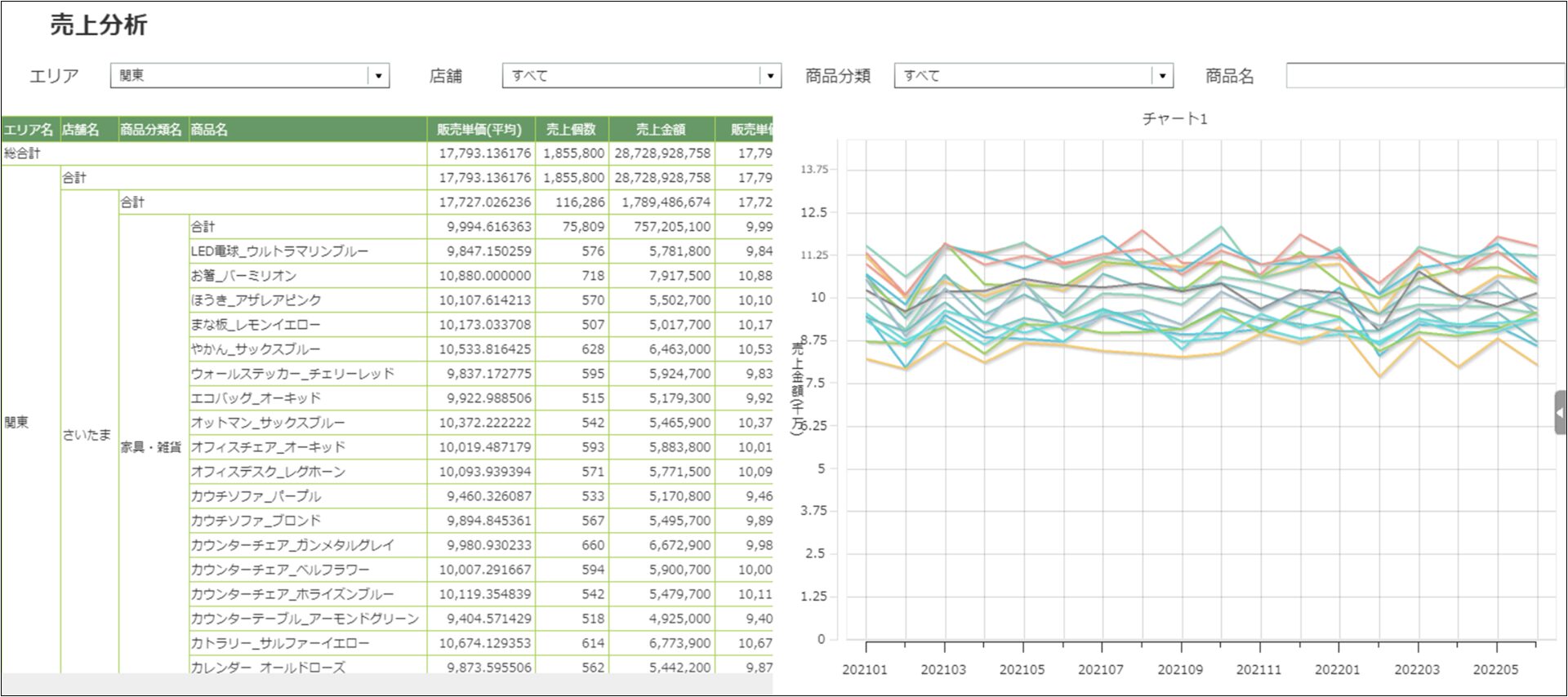 300万件ほどのデータを使用し、集計表と折れ線グラフの2つのチャートを表示します。