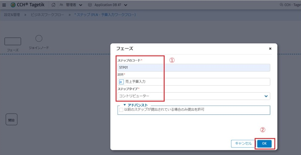 ステップボタンをクリックしてステップの中でタスクワークフローを定義します。