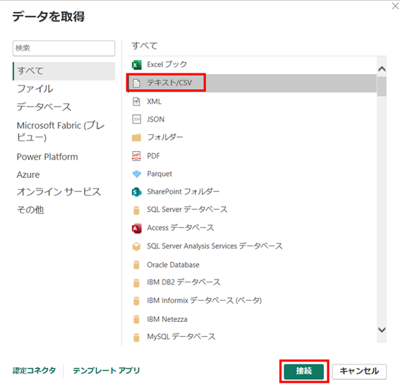 ② 「テキスト/CSV」を選択し、「接続」を選択します。