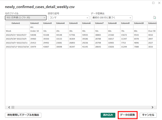 ④ 2行目をヘッダーとして使用するために「データの変換」を選択します。
