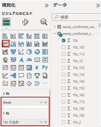 ⑧ 「視覚化」から使用するビジュアルを選択し、可視化したいデータを選択します。